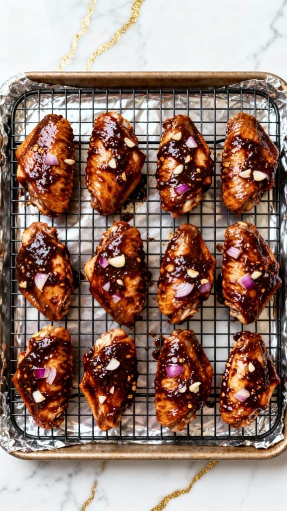 Remove wings from marinade and place them in a single layer on the rack or sheet. Bake at 400°F for 35–40 minutes, turning once halfway.