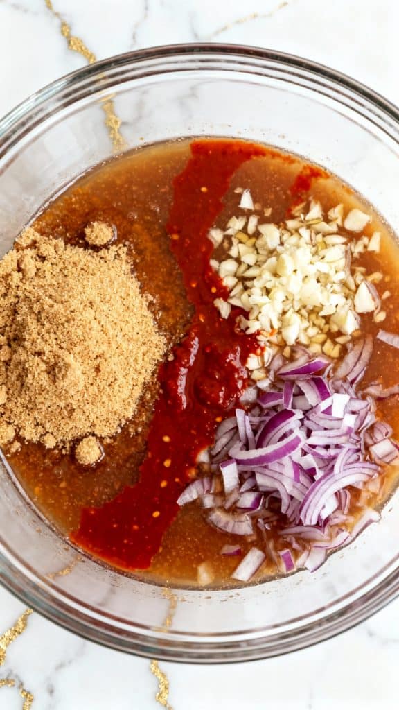 4 tbsp soy sauce, 2 tbsp brown sugar, 1 tbsp honey, 1 tbsp sesame oil, 4 finely minced garlic cloves, 1 tsp grated ginger, 2 tbsp grated red onion, 1 tbsp rice vinegar, 1 tbsp gochujang, and 1 tsp black pepper.