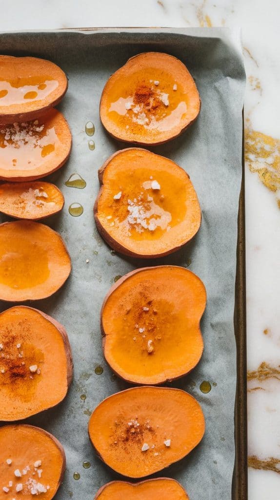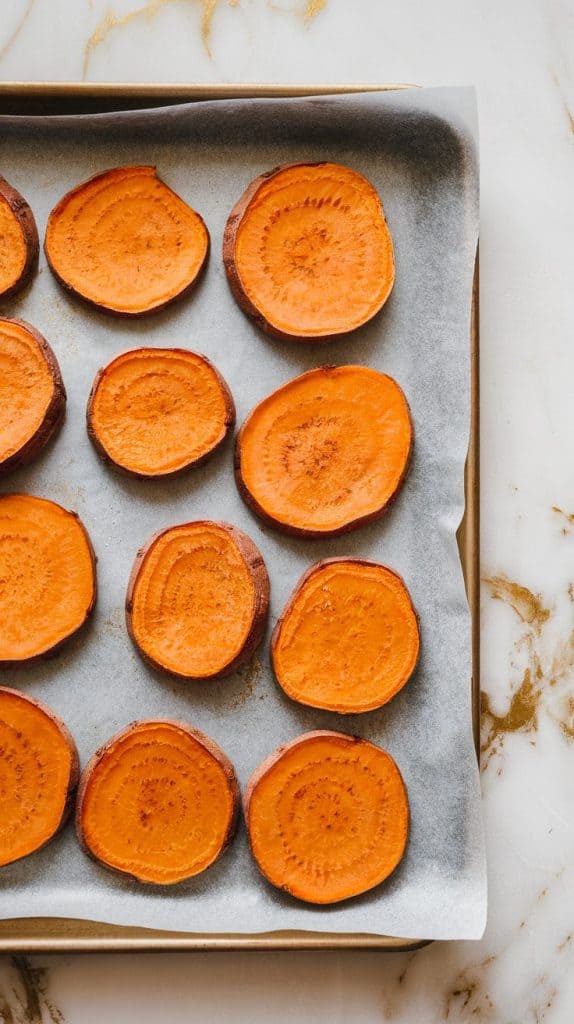 Lay seasoned sweet potato rounds in a single layer on a parchment-lined baking sheet. Roast at 425°F for 25–30 minutes, flipping halfway, until golden brown and edges are crisp.