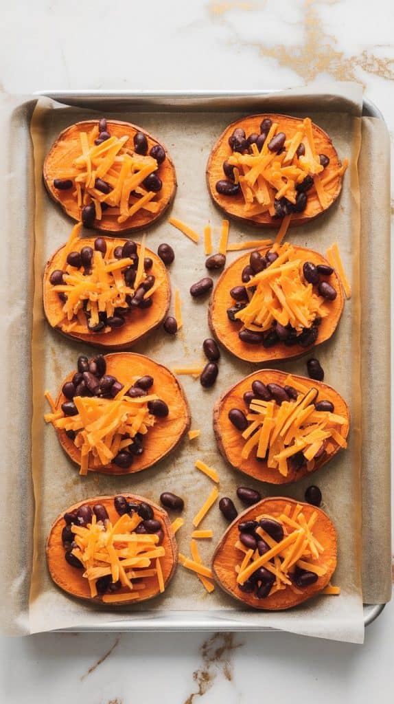 Remove tray from oven and immediately sprinkle 1 cup shredded cheddar cheese and 1 cup drained black beans evenly over the hot sweet potatoes. Return to oven for 3–4 minutes until cheese melts.