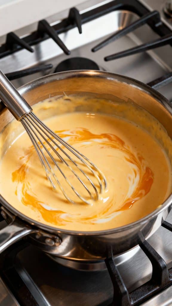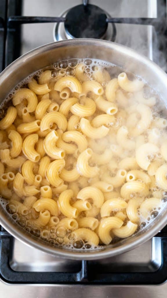 Boil 12 oz elbow macaroni in salted water until just al dente (about 1–2 minutes less than the package says). Drain and set aside.