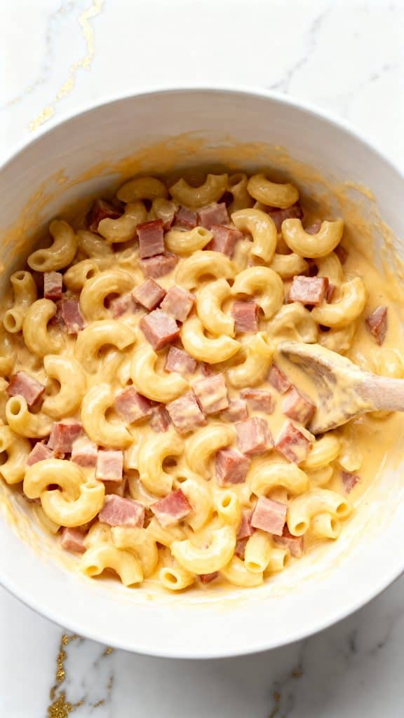 In a large bowl, combine the cooked elbow macaroni, 2 cups diced ham, and the warm cheese sauce. Stir until everything is evenly coated.