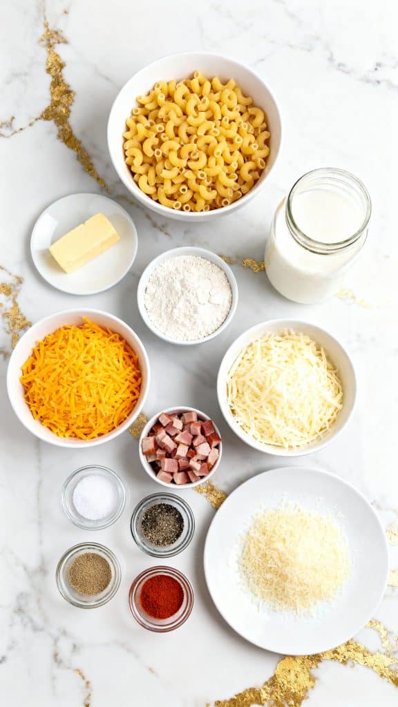 The flour and butter make a roux that thickens the milk into a smooth base for cheese. Using two cheeses gives both stretch and sharp flavor. Ham adds salt and richness. Baking sets everything together and gives you that golden, irresistible top.