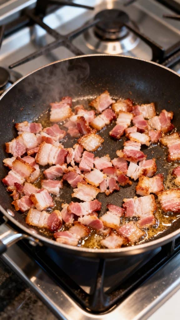 Place 6 slices chopped raw bacon into a large skillet over medium heat. Cook for about 5–6 minutes until the bacon pieces turn crispy and golden brown. Stir occasionally so they cook evenly.