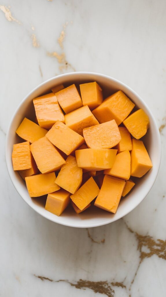 Spread the squash cubes onto a baking sheet lined with parchment paper. Drizzle with 1 tbsp olive oil and sprinkle with ½ tsp salt. Roast at 400°F (200°C) for 25–30 minutes, until soft and slightly golden.