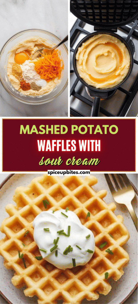 The flour and egg help bind the mashed potatoes so they don’t fall apart in the waffle iron. The cheese adds flavor and gets melty and crispy when cooked. The hot waffle iron creates steam inside the waffle, which keeps it soft in the middle while the outer edges get golden and crispy from direct heat. No need for frying — it crisps up perfectly on both sides.