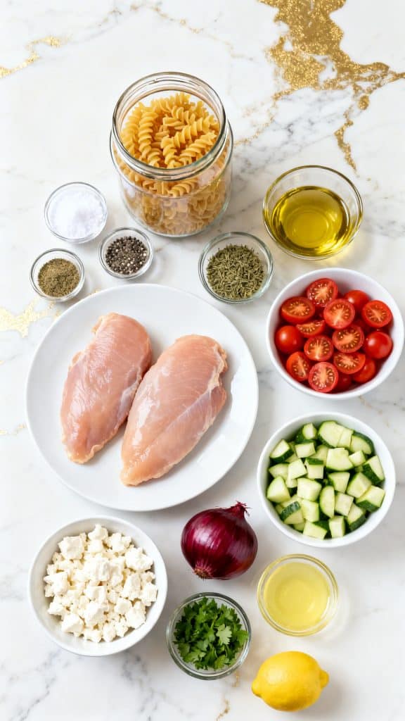 In a large bowl, add cooked rotini pasta, sliced chicken strips, halved cherry tomatoes, diced cucumber, sliced red onion, chopped parsley, and ½ cup crumbled feta cheese. Pour the lemon olive oil dressing over the top. Toss gently until evenly coated.