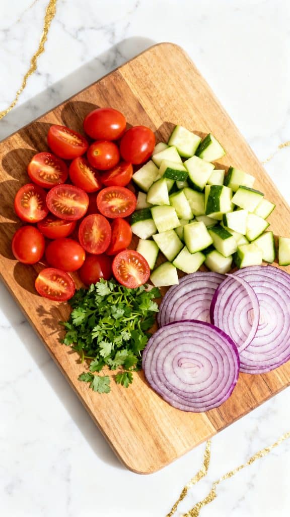 While the chicken rests, halve 1 cup cherry tomatoes, dice 1 cup cucumber, thinly slice ¼ cup red onion, and chop 2 tablespoons fresh parsley.