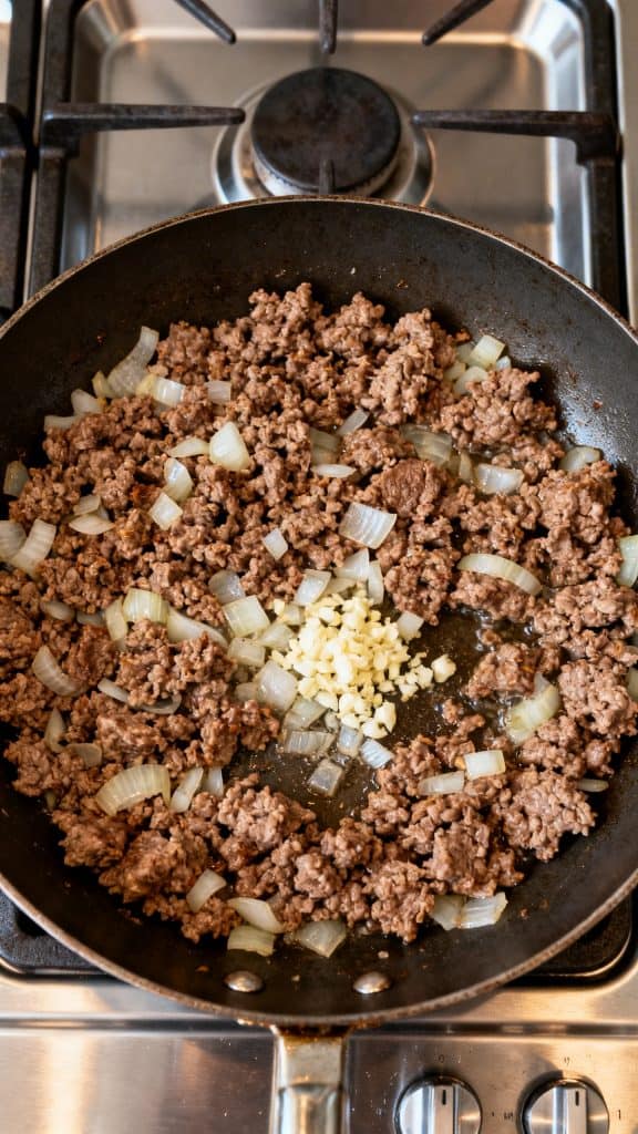 Heat a large skillet on medium heat. Add 1 pound ground beef and 1 cup diced onion. Cook for 6–8 minutes, breaking up the beef with a wooden spoon, until the beef is browned and the onion is soft. Add 2 cloves minced garlic and cook for 1 more minute. Drain any extra grease.