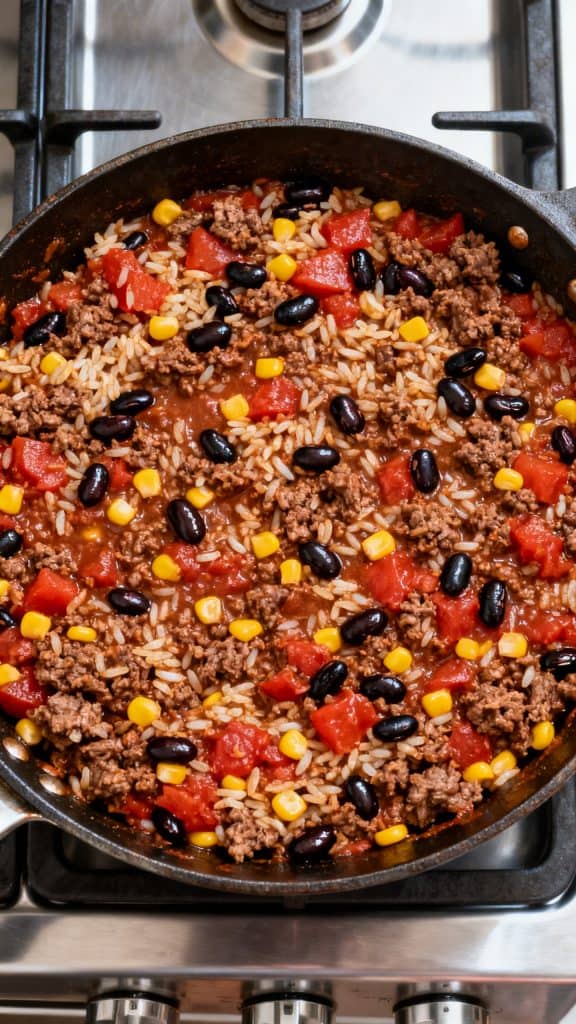 Stir in 1 can drained diced tomatoes, 1 can drained and rinsed black beans, and 1 cup corn kernels. Let it simmer for 5 minutes until slightly thickened.