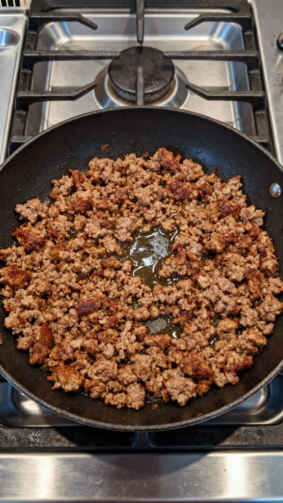 Heat 1 tablespoon olive oil in a large skillet over medium heat. Add 1 pound breakfast sausage and break it into small crumbles. Cook until fully browned and no pink remains, then drain excess grease.