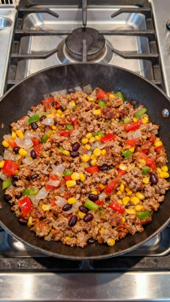 Stir in 1/2 cup black beans and 1/2 cup corn kernels. Cook for 1–2 minutes until warmed through.
