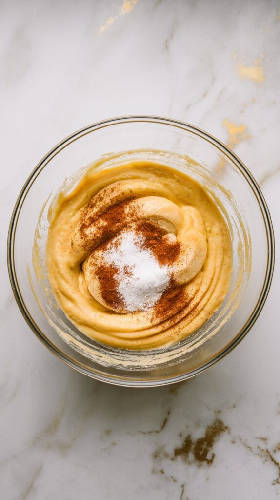 Add ¼ tsp baking powder, a pinch of salt, and ¼ tsp cinnamon to the bowl. Whisk again until you get a smooth, slightly thick batter.