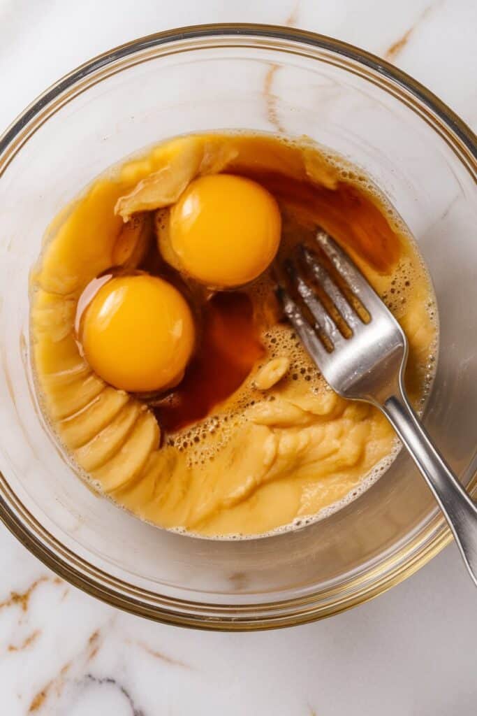 In a mixing bowl, mash 1 ripe banana until smooth. Add 2 eggs and ½ tsp vanilla extract. Whisk everything together until fully combined.