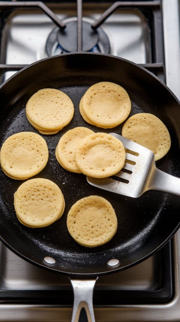 Spoon small rounds of batter (about 2 tbsp each) onto the skillet. Cook for 2–3 minutes until bubbles form and edges look set. Flip and cook 1–2 minutes more until golden. Repeat with remaining batter.