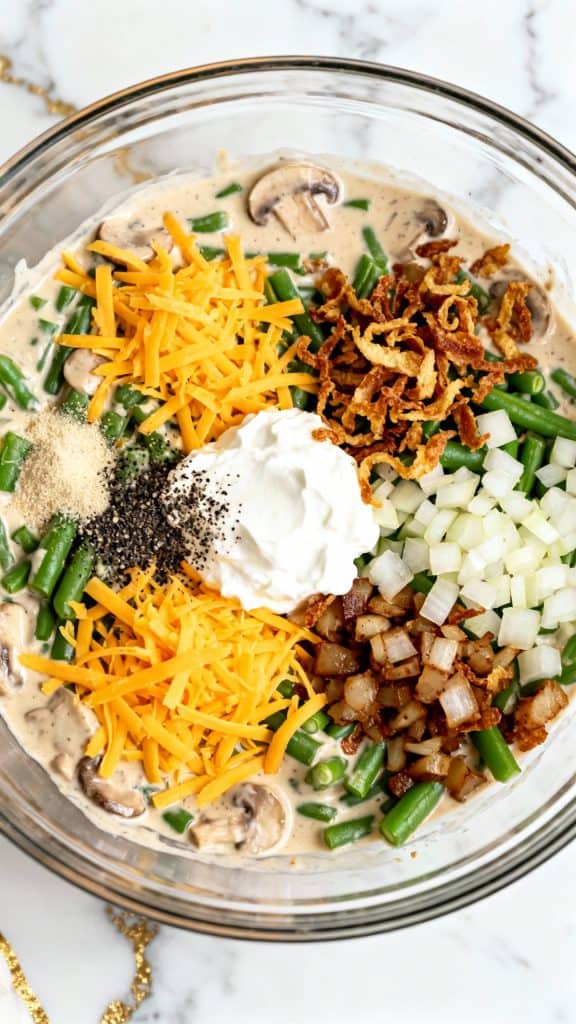 In a mixing bowl, combine 1 ½ cups chopped cooked green beans, 1 cup cream of mushroom soup, ½ cup shredded sharp cheddar cheese, ¼ cup sour cream, ½ tsp garlic powder, ¼ tsp black pepper, ¼ cup cooked diced onion, and ½ cup crispy fried onions. Stir until well mixed.