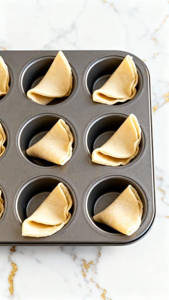Unroll the crescent dough and separate into triangles. Cut each triangle in half and gently press each piece into a greased muffin cup, covering the bottom and sides.