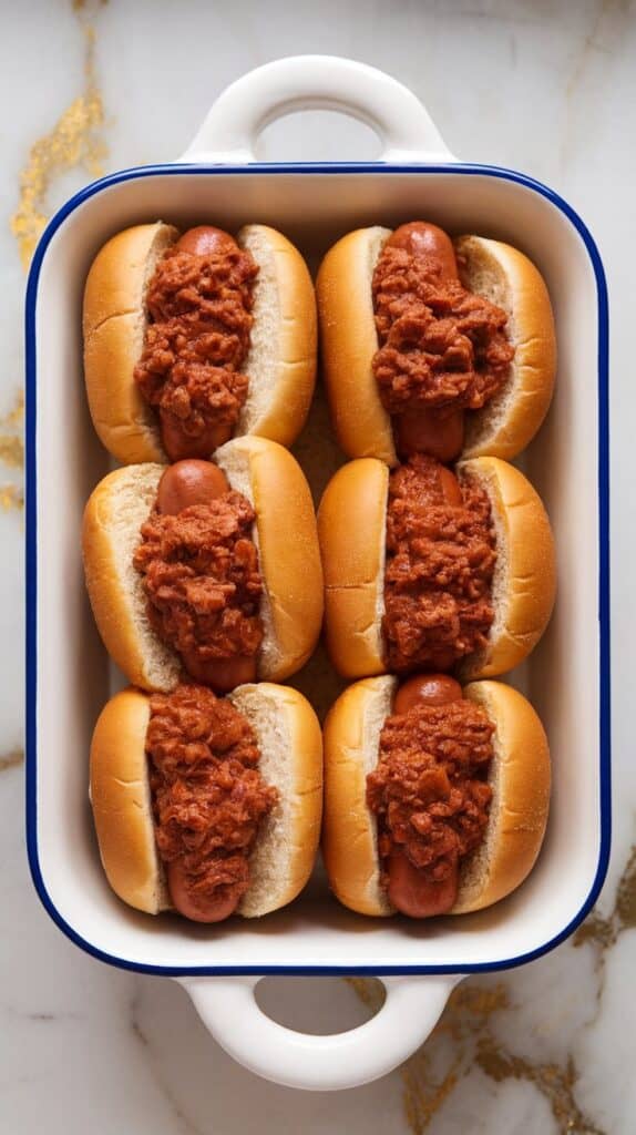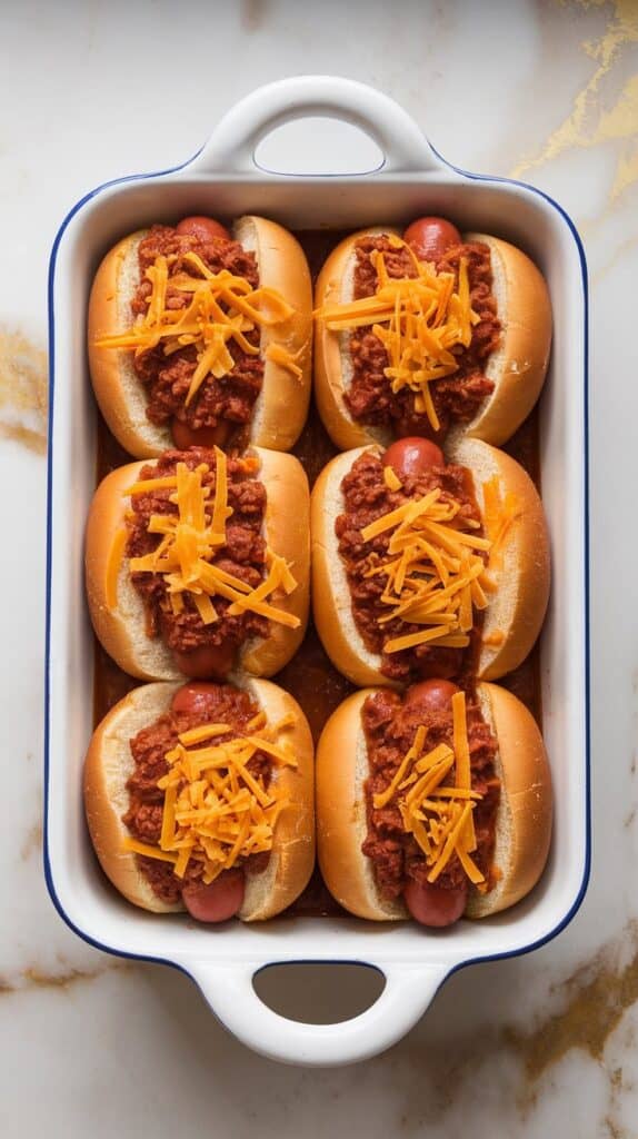 Baking the hot dogs in buns lets the flavors soak into each other — the buns absorb the beefy chili and cheesy goodness without falling apart. The cheese on top acts like a lid, trapping in moisture and heat so everything cooks evenly and stays juicy.