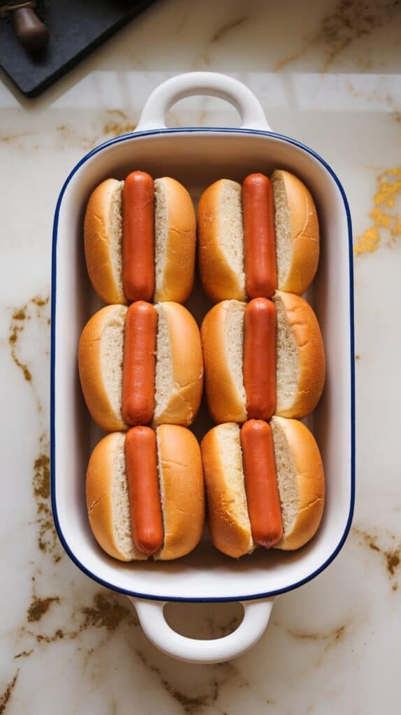 Place 6 hot dog buns in a 9×13” baking dish. Nestle 1 all-beef hot dog into each bun.