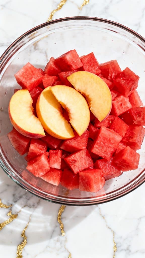 In a large mixing bowl, add 4 cups diced seedless watermelon and 3 ripe peaches that have been thinly sliced. Keep the fruit in larger pieces so it does not get mushy.
