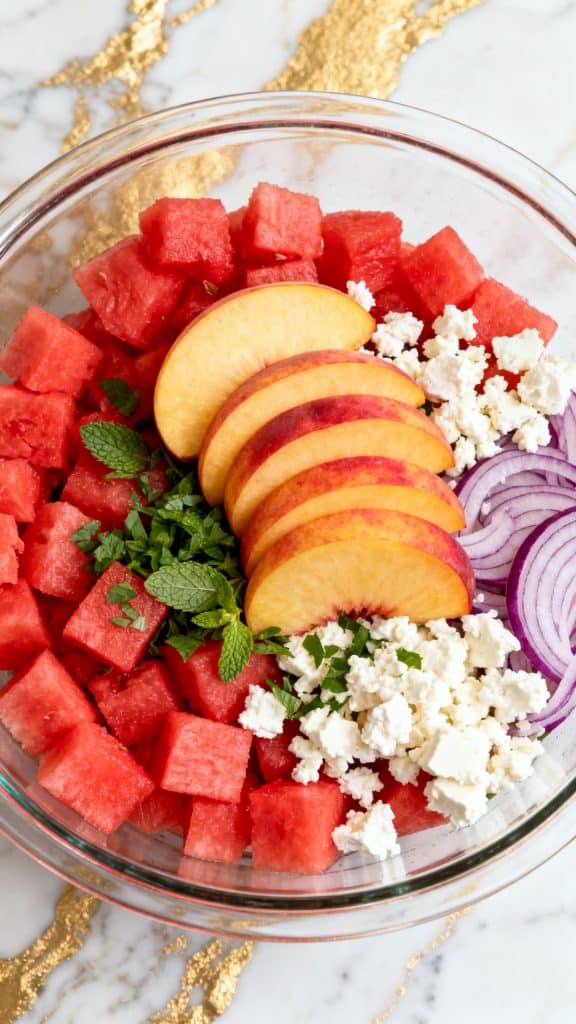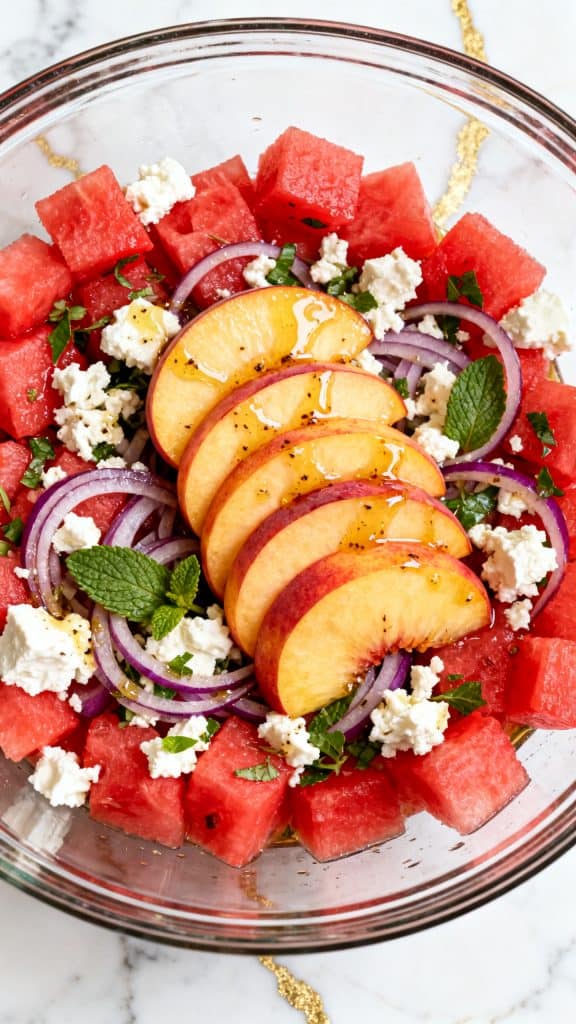 Add 1/2 cup crumbled feta cheese, 1/4 cup thinly sliced red onion, and 1/4 cup chopped fresh mint to the bowl with the watermelon and peaches.