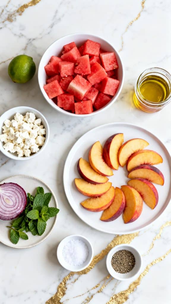 Watermelon is full of water, so it makes the salad cool and juicy. Peaches add soft sweetness. Feta brings salt, which makes the fruit taste even sweeter. Lime juice adds acid, so the salad tastes bright instead of flat. Mint adds a fresh smell and flavor that makes each bite feel light.