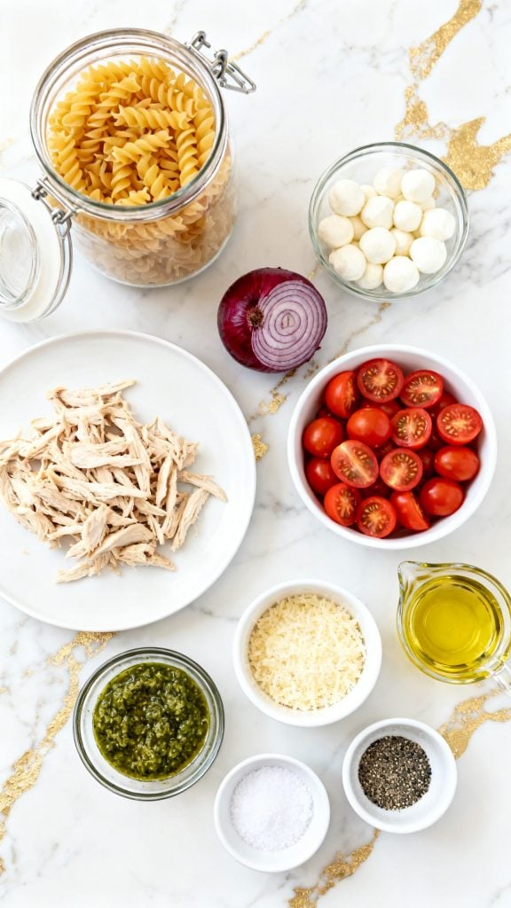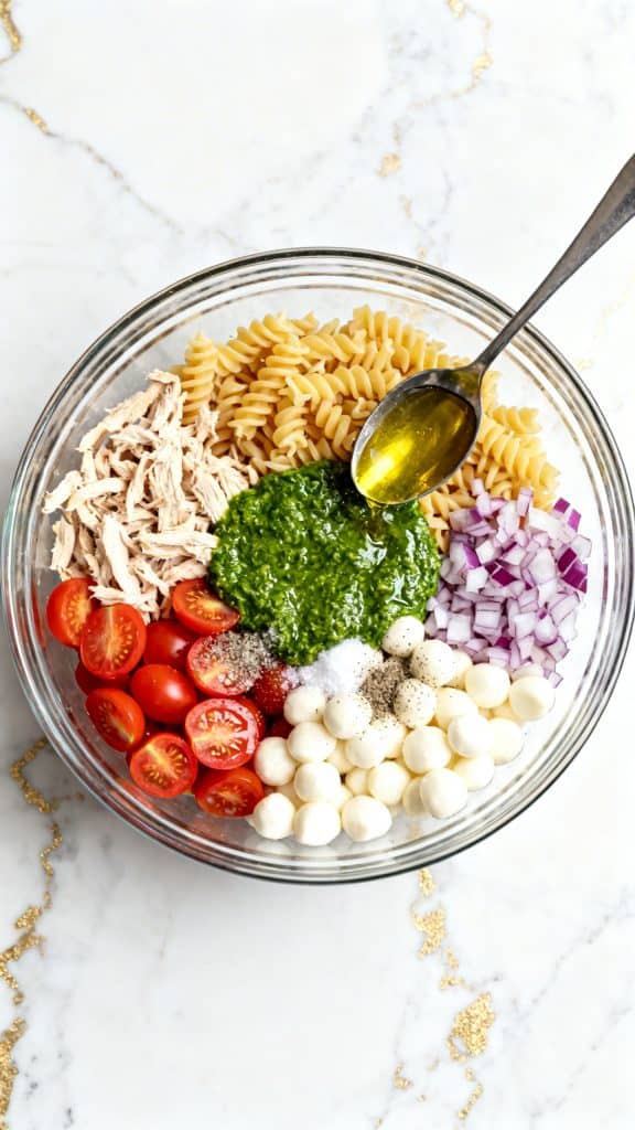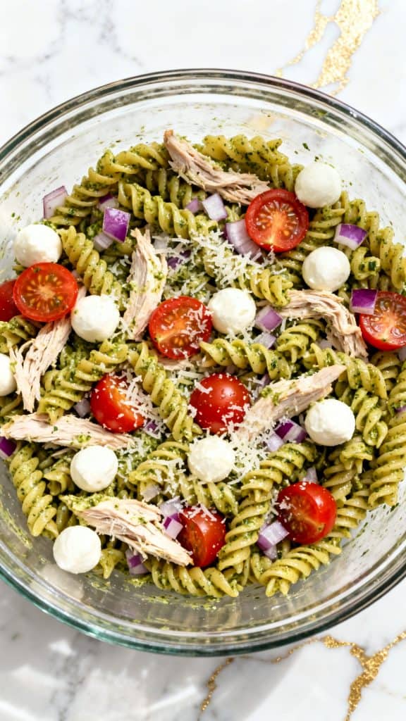 I first made this on a warm afternoon when I wanted something that didn’t require turning on the oven. I had leftover shredded chicken, some pasta, and a jar of pesto in the fridge. I tossed everything together and added a few fresh ingredients for color and crunch. The result was one of those dishes you keep going back to for “just one more bite.”