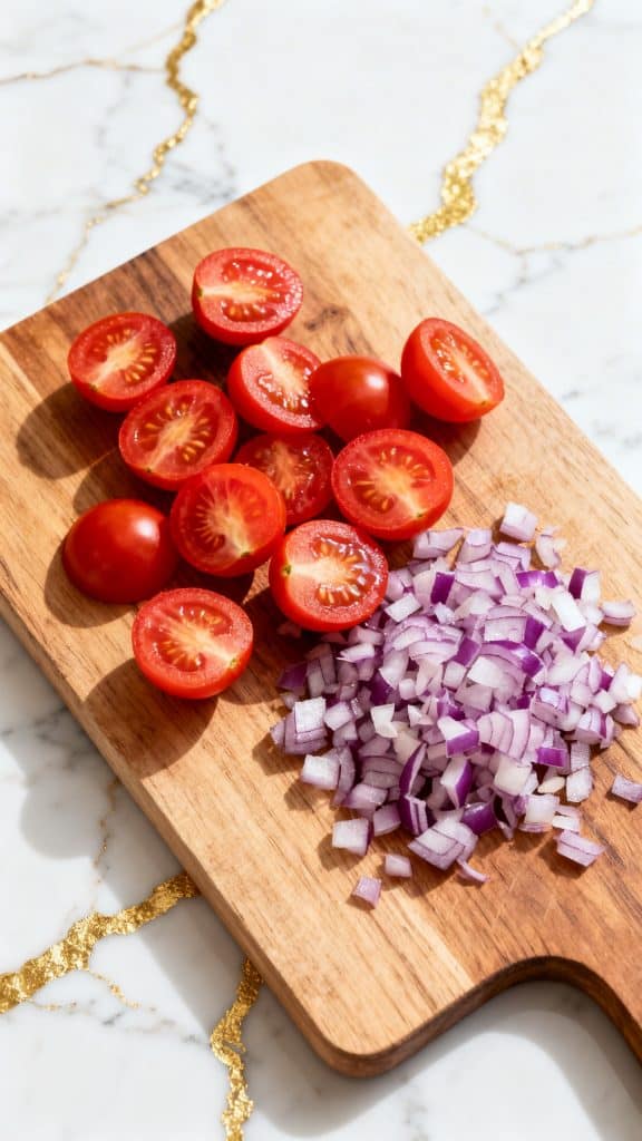 While the pasta cooks, prep the mix-ins. Cut 1 cup cherry tomatoes in half and dice 1/4 cup red onion into small pieces.