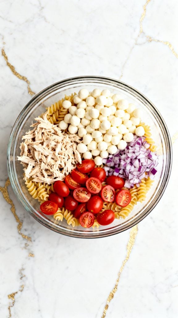 Add the slightly cooled cooked rotini pasta to a large bowl. Add 2 cups shredded cooked chicken, 1 cup halved cherry tomatoes, 1/4 cup diced red onion, and 3/4 cup mozzarella pearls.