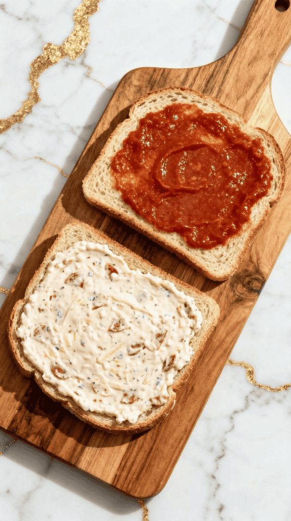 Lay 2 slices of sourdough bread on the surface. Spread half the cheese mixture on one slice. Spread 1–2 tablespoons of pizza sauce on the other slice, then press them together.