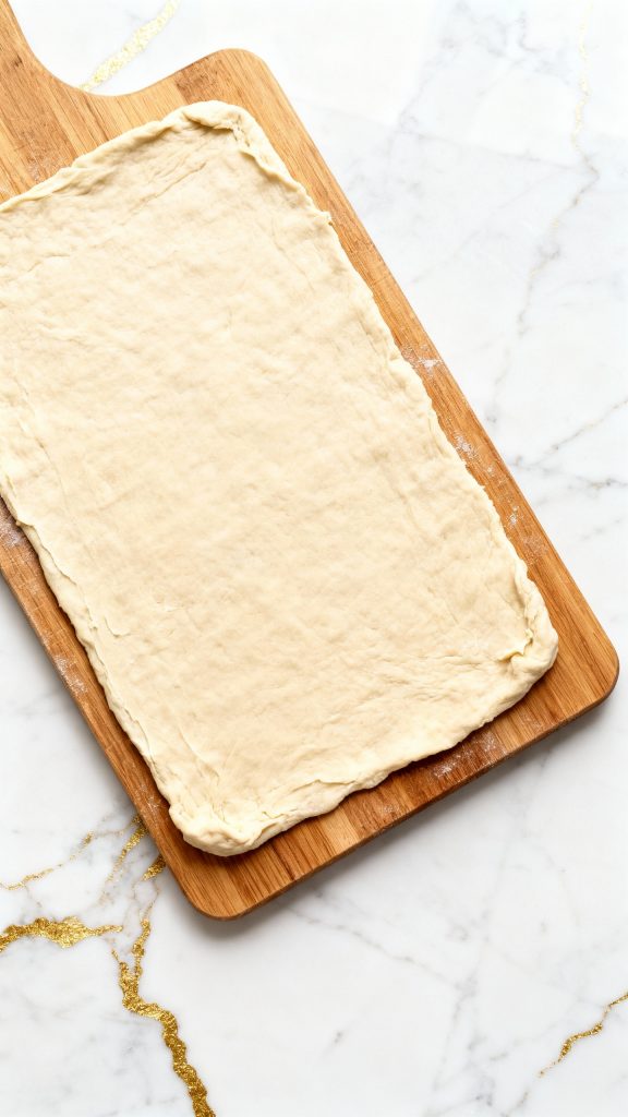 Lightly flour your surface and roll out the pizza dough into a large rectangle, about ¼ inch thick. Try to keep the edges as even as possible for easier rolling later.