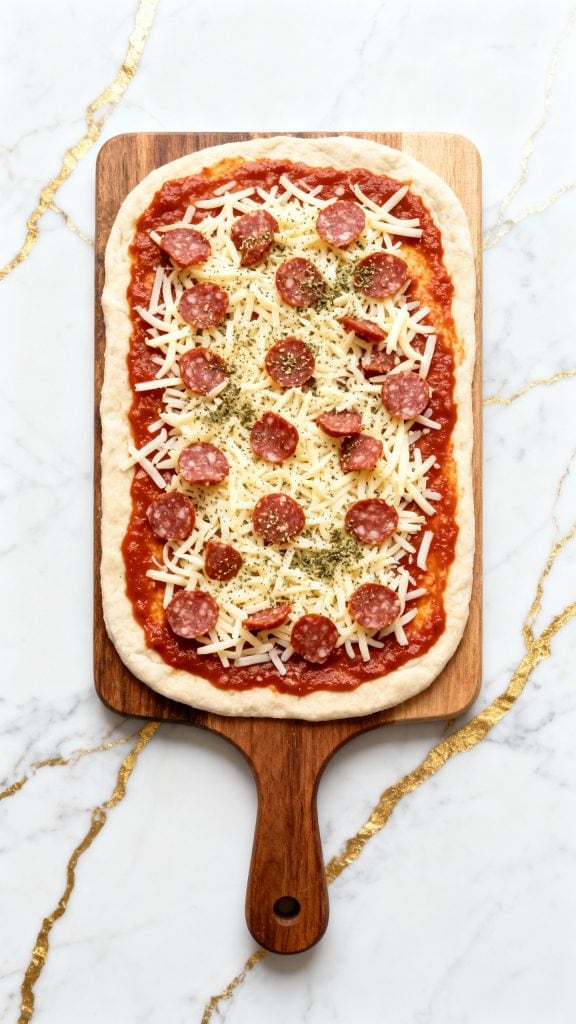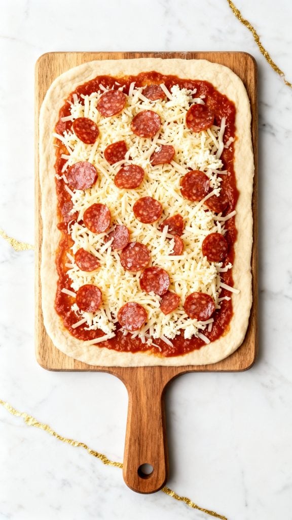 Sprinkle 1 cup shredded mozzarella and 12 chopped pepperoni slices evenly on top of the sauce.