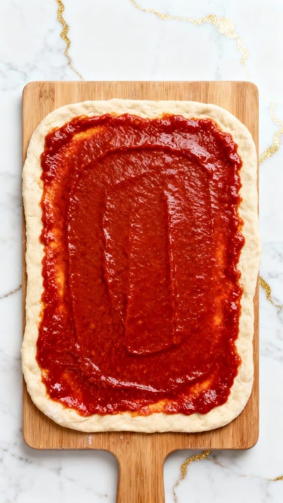 Spread ½ cup pizza sauce evenly over the dough, leaving a small border around the edges.