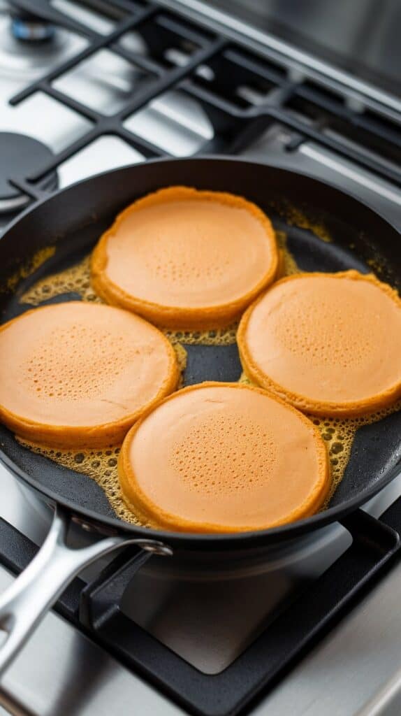 Pour about ¼ cup of batter per pancake into the skillet. Cook for 2–3 minutes, until bubbles appear and the edges look set. Flip and cook another 1–2 minutes until golden brown and cooked through.