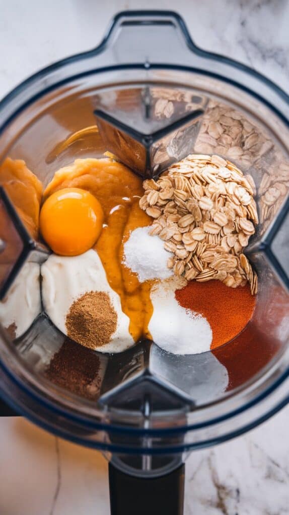 Add ½ cup canned pumpkin puree, ½ cup cottage cheese, 2 large eggs, ½ cup rolled oats, 1 tbsp maple syrup, ½ tsp baking powder, ½ tsp cinnamon, ¼ tsp pumpkin pie spice, 1 tsp vanilla extract, and a pinch of salt to a high-speed blender.