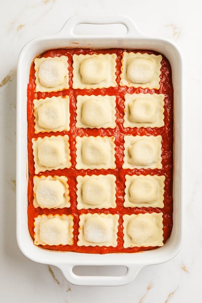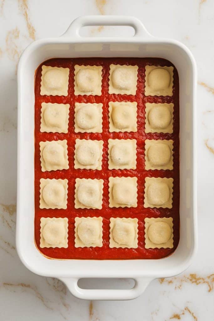 Spread 1/2 cup of marinara sauce on the bottom of the dish. Layer half of the frozen ravioli (about 12 oz) evenly across the bottom.