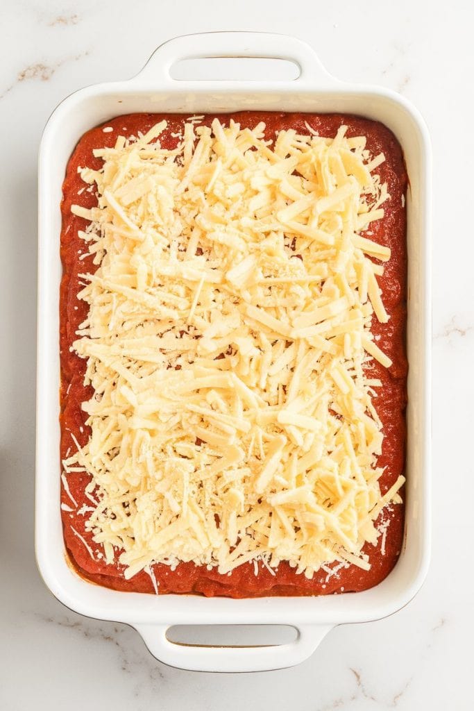 Top with the remaining marinara sauce (about 1/2 cup), then sprinkle 1 1/2 cups shredded mozzarella evenly over the top.