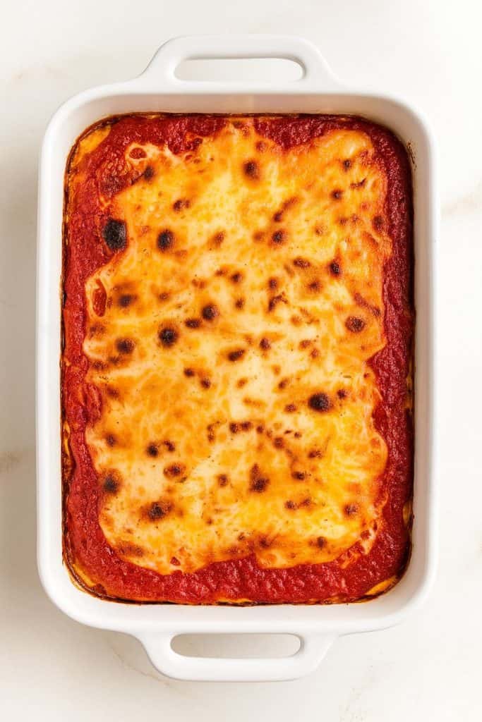 Frozen ravioli acts like pre-filled pasta sheets — when baked, they soften in the sauce just like traditional lasagna noodles. Ricotta and egg create a creamy layer that sets nicely during baking, while mozzarella melts into gooey, stretchy layers. Parmesan adds salty, sharp flavor to round it all out.