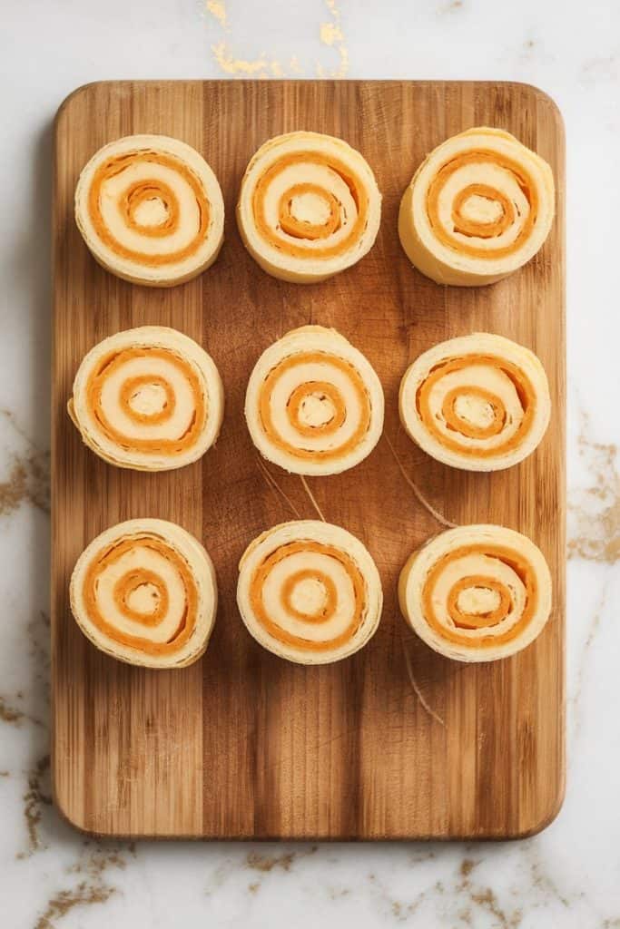 Use a sharp knife or pizza cutter to slice the log into 10–12 even pinwheels, about ¾ inch thick each.
