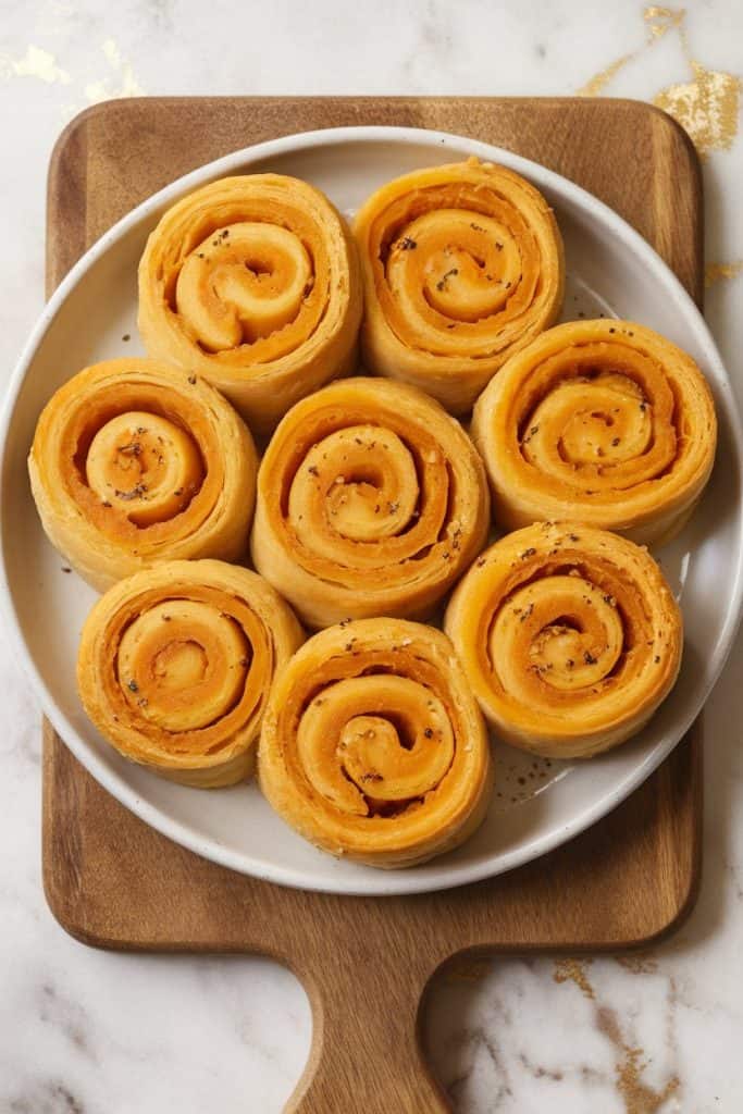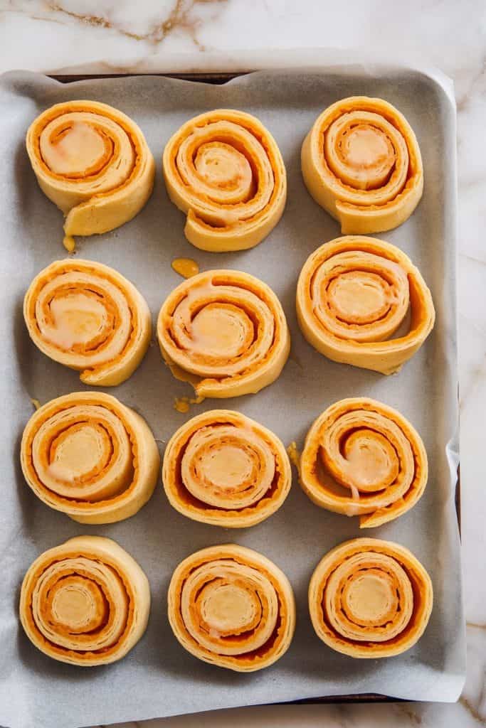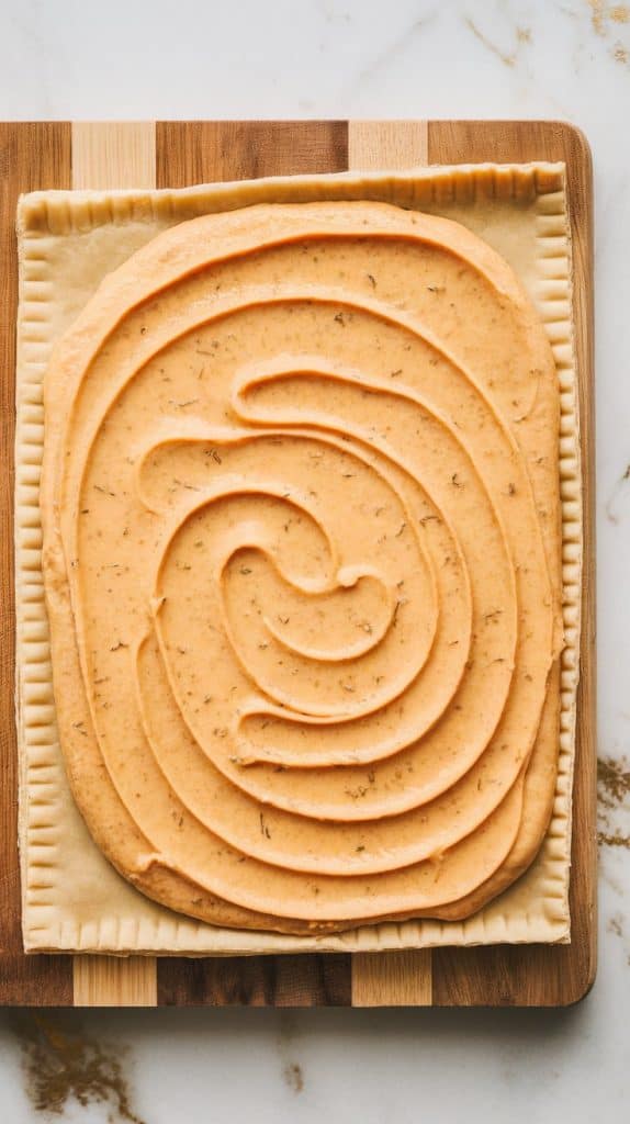 You can prep the filling and roll the log in advance. Wrap it in plastic and chill for up to 24 hours. When ready to bake, slice, brush with egg wash, and bake straight from the fridge. Baked pinwheels can also be reheated in a 350°F oven for 5–6 minutes.