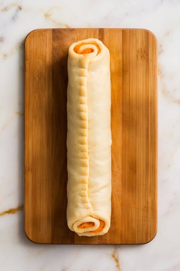 Carefully roll up the puff pastry from one side to the other into a tight log, keeping the filling inside. Press lightly to seal the edge.
