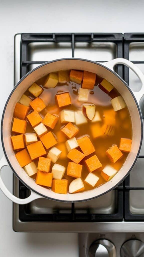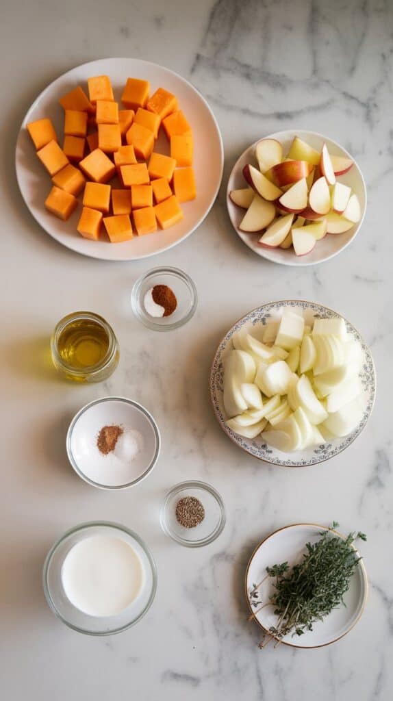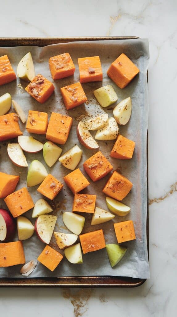 Preheat your oven to 400°F (200°C). On a parchment-lined baking sheet, spread 3 cups diced butternut squash, 1 chopped apple, 1 quartered yellow onion, and 3 peeled garlic cloves. Drizzle with 1 tablespoon olive oil and sprinkle with ½ teaspoon salt, ¼ teaspoon pepper, ½ teaspoon cinnamon, and ¼ teaspoon nutmeg. Toss to coat and roast for 30–35 minutes, until soft and caramelized.