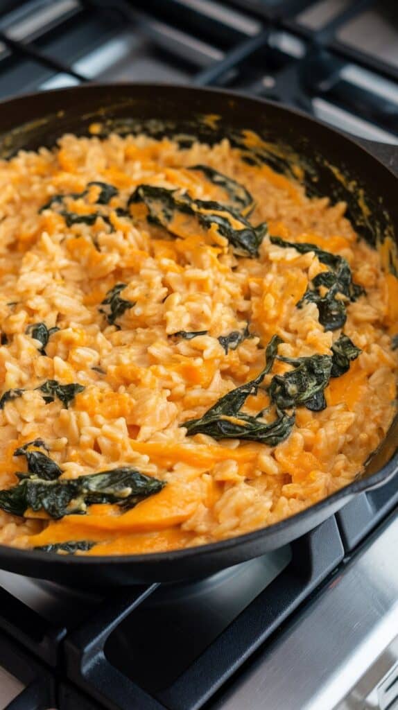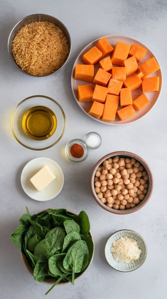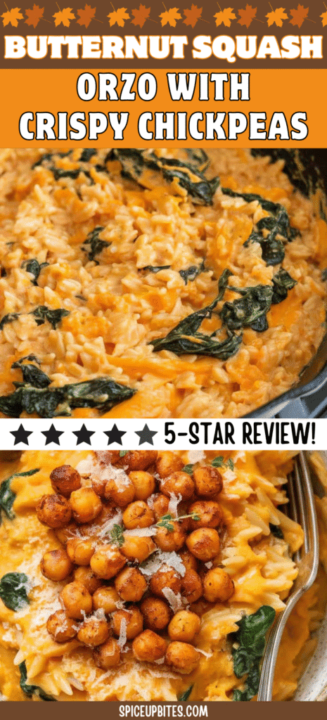 You’ve got creamy orzo swirled with sweet roasted butternut squash and wilted spinach, all finished off with a good handful of crispy chickpeas on top — not mixed in — so they stay crunchy.