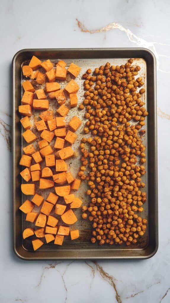 Preheat oven to 425°F. On a large baking sheet, add 2 cups diced butternut squash to one side and 1 can chickpeas (drained, rinsed, and patted dry) to the other. Toss squash with 1 tbsp olive oil, ¼ tsp salt, ¼ tsp black pepper, and ¼ tsp dried thyme. Toss chickpeas with 1 tbsp olive oil, 1 tsp smoked paprika, ¼ tsp salt, and ¼ tsp black pepper. Spread both in single layers, keeping them separate. Roast for 25–30 minutes, flipping each halfway through.