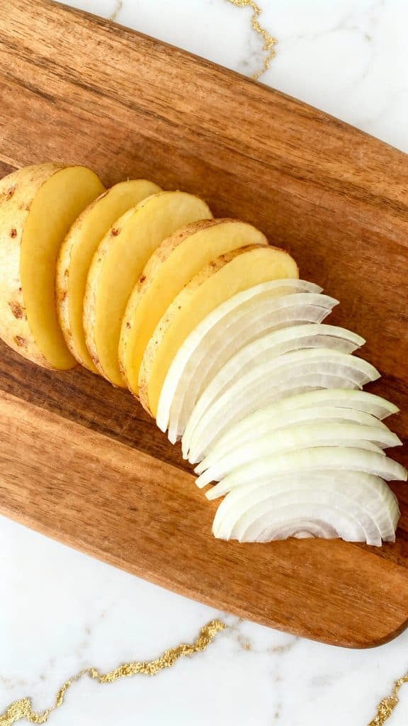 Thinly slice 2 pounds of peeled russet potatoes and 1 small onion.