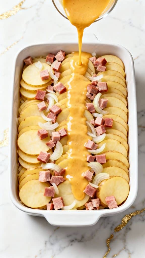 Layer half the sliced potatoes in the greased baking dish. Top with half the sliced onion and half of the diced ham. Pour half the cheese sauce over. Repeat with remaining potatoes, onion, ham, and cheese sauce.