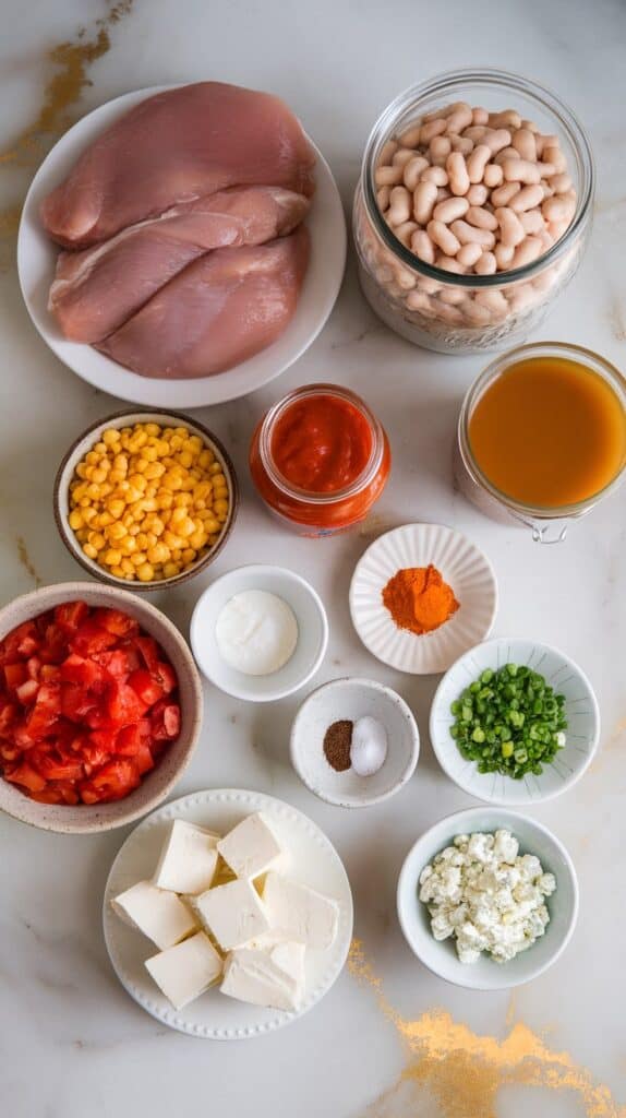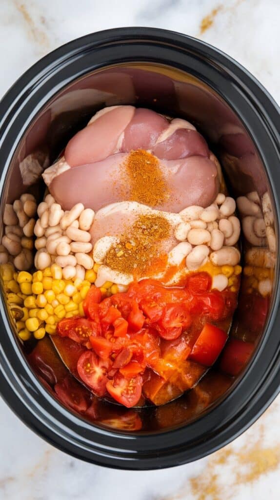 Place 1.5 lbs raw boneless, skinless chicken breasts at the bottom of the slow cooker. Top with 1 (15 oz) can drained white beans, 1 (15 oz) can drained corn, 1 (14.5 oz) can diced tomatoes with juices, 1/2 cup buffalo wing sauce, and 1/2 cup chicken broth. Sprinkle in 1 tsp onion powder, 1 tsp garlic powder, 1/2 tsp smoked paprika, 1/2 tsp salt, and 1/4 tsp black pepper.