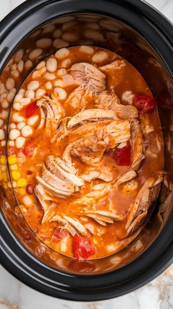 The slow cooking method helps the chicken become ultra-tender so it shreds perfectly and absorbs all the buffalo sauce flavor. The beans and corn release just enough starch to help thicken the chili slightly, while the cream cheese stirred in at the end makes everything velvety without needing a roux.