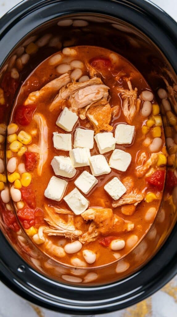Add 8 oz cubed cream cheese on top. Cover and cook on high for another 10–15 minutes until the cream cheese softens.