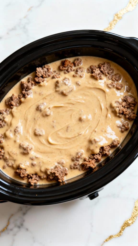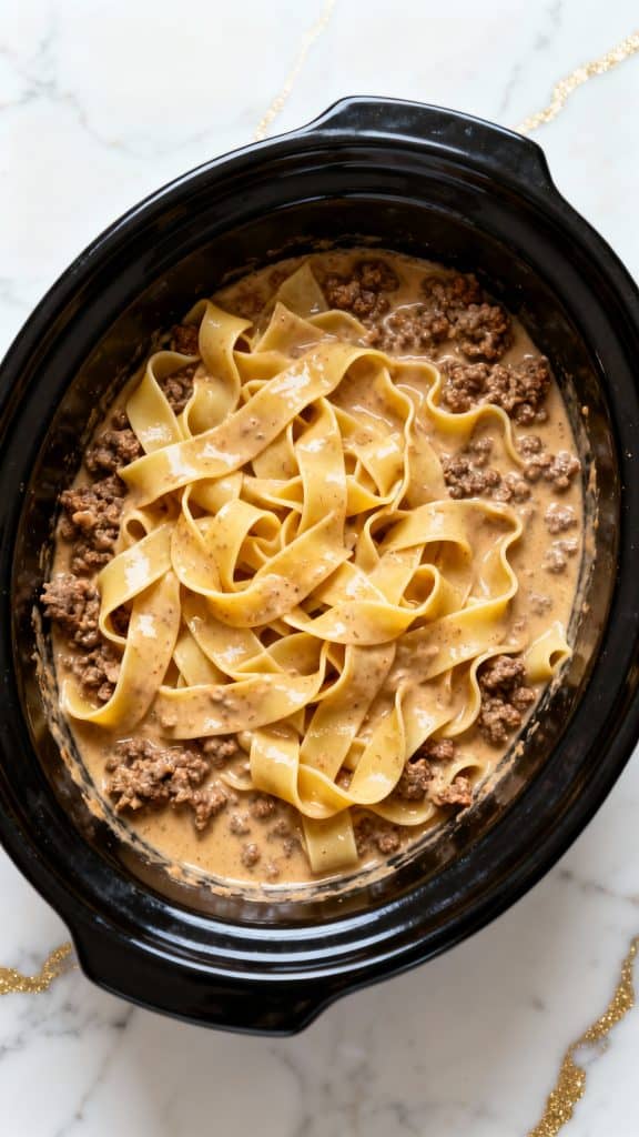 Stir uncooked wide egg noodles into the creamy beef mixture in the crockpot. Cover and cook on High for 15–20 minutes, until noodles are tender. Add a splash of broth if it gets too thick.
